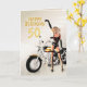 Une fille avec une moto pointant vers le message Joyeux Anniversaire. Une grande carte pour l'homme qui aime ses vélos !