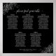 Ce tableau de sièges mariage de 5 tables aidera vos invités à trouver la bonne table à votre réception. Le design est à la fois simple et élégant avec du texte gris pâle sur un arrière - plan noir et un faux fil argenté en dentelle dans les coins. Le titre dit "s'il vous plaît trouvez votre table" dans une élégante calligraphie de script. Sophistiqué et chic. Comprend l'assignation de table pour 50 personnes avec 10 sièges par table.