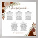 Ce beau tableau de 5 places mariage peut accueillir 50 convives à 5 tables avec 10 places à chaque table. Il présente un design floral chic boho rustique avec des roses d'aquarelle peints à la main dans les tons de rouille orange, de pêche de corail et de bois brûlé, ainsi que des feuilles d'eucalyptus et du feuillage du jardin d'automne. L'élégant titre de calligraphie script, ajoute style et grâce avec espace pour les noms du couple et mariage date ci-dessous.