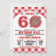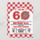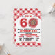 60e anniversaire Barbecue Invitation avec un grill chaud rouge et en vichy motif de nappes. Customisez avec votre propre texte. Illustration d'origine par pj_design.