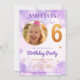 Celebrate special day with this enchanting purple and gold 6th birthday party invitation! Featuring a dreamy watercolor background with sparkling gold glitter accents and whimsical stars, this design is perfect for a magical celebration. Easily personalize with your photo, name, and all your party details for a truly unique invitation that will delight guests and create lasting memories. Make her 6th birthday unforgettable with this beautiful and customizable design.