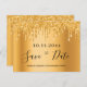 Une carte moderne et branchée Save the Date pour une fête de 70e anniversaire. Un arrière - plan à l'allure fausse or décoré de faux gouttes d'or. Personnalisez et ajoutez une date et un nom/âge 70. Lettres de couleur noire. Le texte : Save the Date est écrit avec un grand script de style à la main tendance. Conseil : Si vous ne voulez pas qu'il ressemble à une carte postale, cliquez sur customiser, allez à l'arrière et retirez le séparateur et le timbre postal.