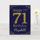 Joyeux Anniversaire avec simulateur de parties scintillant dorée numéro 71 sur bleu violet foncé et encadré de faux diamants et de strass. Joyeux anniversaire et nom des destinataires en caractères blanc cassé. Personnalisez avec un nom ou un message.