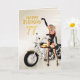 Une fille avec une moto pointant vers le message Joyeux Anniversaire. Une grande carte pour l'homme qui aime ses vélos !