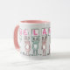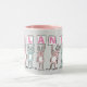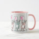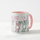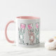 Fun Rabbit Design Mug pour quelqu'un avec un nom de 7 lettres. Fun rose et blanc Mug avec l'illustration de lapins en rose et bleu. Les lapins tiennent des cartes pour épeler le nom. L'exemple est Melanie. De mignons lapins bébés.