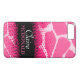 Coque iphone à motif animal brillant dans les tons noir et rose. Personnalisez cet objet avec votre nom complet. Voici l'exemple actuel : Claire Mcdonald. Ce motif original de Sarah Trett, est basé sur le dessin trouvé sur une girafe avec un moiré mi-teint point gain motif superposition.