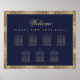 Un tableau de sièges vintage et élégant avec 7 tables, recommandé pour un mariage aux couleurs mariage marine et or. L'arrière - plan est bleu marine. Il a des bordures fleuries dorées avec des décorations roses sauvages complexes. Tout le texte est doré. Le mot Welcome dans la partie supérieure est écrit dans un élégant script calligraphique, le reste en casquette. Les décorations roses d'or sont tirées d'une couverture vintage de 1912, de l'ouvrage Complete Poetical Works de Geoffrey Chaucer, désormais dans le domaine public.