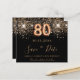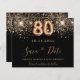 Une fille et tendance Enregistrer la date pour une fête de 80e anniversaire. Un arrière - plan noir décoré de parties scintillant en faux or. Modèles pour une date, un nom et un texte. Lettres de couleur dorée. Le texte : Save the Date est écrit avec un grand script de style à la main tendance.