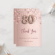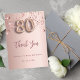 Un carte de remerciements pour un 80ème anniversaire. Couleur arrière - plan rose or dégradé. Avec de l'or rose gouttant des étoiles brillantes. A l'avant : numéro 80 écrit avec une police de style ballon, grand rose foncé écriture manuscrite couleur or et le texte : Merci, votre texte, titre et une date. Retour : Personnalisez et ajoutez Votre note de remerciement et votre nom.