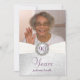 Invitations personnalisées de fête d'anniversaire — invitations photo de poche entièrement personnalisables avec arrière - plan vintage en argent et en lavande damassé et élégant bouton Monogramme sur ruban blanc. Ajoutez votre propre photo et customisez le nom, la date et les détails de l'occasion heureuse. Parfait pour les photos contemporaines ou vintages. Des enveloppes de correspondance, des cartes postales et des cartes de remerciements sont disponibles.**IMPORTANT : Pour les cartes d'invitation standard 5 x 7. Autres tailles et styles disponibles dans la galerie.