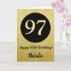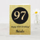97th Happy Birthday Black and Gold Parties scintillant Card avec nom personnalisé. Pour plus de personnalisation, cliquez sur le bouton "Customiser" et utilisez notre outil de conception pour modifier ce modèle.