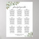 Ce beau tableau de sièges mariages comprend des assignations de table pour 90 personnes avec 10 places par table pour un total de 9 tables. Le design bohème chic rustique présente des feuilles d'eucalyptus aquarelles et des feuillages dans les tons menthe, mousse et vert sauge. Toute la verdure et le feuillage sont peints à la main avec des aquarelles. Le titre de calligraphie du script de dentelle dit : Veuillez trouver votre table, et les noms du couple et de la date mariage apparaissent en bas. Une façon merveilleuse d'aider vos invités à trouver leurs sièges tout en ajoutant élégance et style à votre réception.