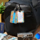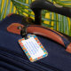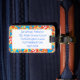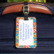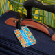 Une étiquette assez double face et acrylique de bagage avec partout un motif des fleurs rouges, oranges, jaunes sur un arrière - plan lumineux de turquoise, d'un collage de papier peint à la main par Judy Adamson. La courroie est en cuir.
