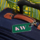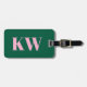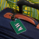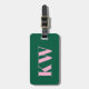 Cette étiquette de bagage comporte vos initiales et vos coordonnées en rose sur fond vert.