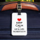 M. et Mme gardent une étiquette de bagages calme pour les jeunes mariés. Marque de voyage romantique avec symbole de coeur rouge. Balises de voyage amusantes pour les sacs et les valises d'un couple marié qui part en voyage de noces. Design de slogan vintage personnalisable pour les voyageurs nouvellement mariés. Rouge ou toute couleur personnalisée. Créez votre propre mignon Gardez calme et continuez la parodie mariage pour marié et marié. La couleur et le texte de l'Arrière - plan peuvent être personnalisés. Amour et romance thème idée cadeau pour mari et femme mariés récemment. Faites-en un pour lui et elle.