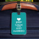 M. & Mme Restez calme, nous venons d'être mariés avec une étiquette à bagages. Marque de voyage rouge romantique avec symbole de coeur. Balises de voyage amusantes pour les sacs et les valises d'un couple marié qui part en voyage de noces. Design de slogan vintage personnalisable pour les voyageurs nouvellement mariés. Rouge ou toute couleur personnalisée. Créez votre propre mignon Gardez calme et continuez la parodie mariage pour marié et marié. Couleur arrière - plan turquoise et texte peuvent être personnalisés. Thème d'amour et de romance.