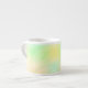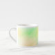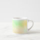 A ceramic mug on a white marble surface features a pastel gradient of green, yellow, and peach hues, creating a soft and calming appearance.