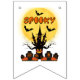 Cette bannière de fanions affiche les mots "Spooky" dans une police d'impression unique avec des lettres orange plus une maison dans l'arbre effrayante, des citrouilles, des chauves-souris et un cimetière avec d'autres autocollants de thème effrayant dans ce thème et style d'Halloween. Toutes les bannières ont une impression unilatérale sûre pour l'extérieur, fabriquées en plastique polystyrène robuste et une corde en plastique épais avec (16) drapeaux à queue d'hirondelle de 5,5" x 8" sur une corde de 6 pieds de long.