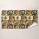 This design features a repeating Christmas pattern that looks like old-fashioned wrapping paper. It displays classic pictures of Santa Claus in his red suit standing next to a reindeer, along with large green holly wreaths tied with red ribbons that circle a snowy winter scene. The design is filled with traditional holiday details like lit candles, scrolls with greetings like "A Happy Christmas Tide," and warm colors that create a cozy and festive feeling.