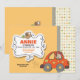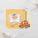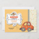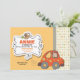 Une invitation adorable montrant une petite fille conduisant une voiture et une ondulation. Un panneau décoratif avec un oiseau brun tient l'information de la partie.