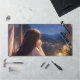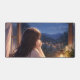 Inside the room, the gentle presence of the lamp and delicate curtains adds warmth and comfort, balancing the cool stillness outside. The scene evokes a sense of peaceful longing and wonder, as if the girl is lost in her thoughts, finding silent companionship in the vast, starry night.