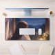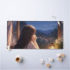This serene illustration captures a quiet, introspective moment as a young girl gazes out of her window at the luminous full moon. The soft glow of moonlight fills the night sky, casting a calming blue hue over the distant hills and the warmly lit village below, creating a beautiful contrast between solitude and life.