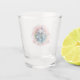 Un verre de tir avec un dessin de crâne néon et le logo de l’auteur Hunter Holmes.
