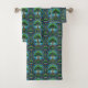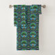 "A towel and washcloth set featuring a vibrant tree of life pattern in green, blue, and purple tones. The intricate, colorful design creates a lively, artistic feel."