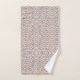 A vibrant, colorful towel hangs on a rod, featuring a psychedelic pattern of swirling shapes in pink, blue, green, and yellow. The design is lively and intricate.
