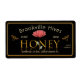 Étiquette noir avec le mot HONEY écrit & reflété en or métallique sur arrière - plan noir avec double bordure en or. Illustration fleur sauvage rouge et abeille dorée. Texte modifiable : "pur, brut."