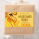 Étiquette produit apiculteur avec une cuillère à tremper de miel goutte de miel doré, attirant l'attention d'une abeille miel. Personnalisez avec le nom de votre apiculteur ou apiculteur, adresse, type de miel, cire d'abeille, bougies et autres produits apiaires, sur un motif de nid d'abeille jaune or. Trouvez les étiquettes de boîte à miel carte de visite et peigne coupés correspondants dans la collection.