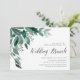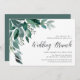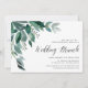 D'élégantes invitations pour un brunch botanique post-mariage sont accompagnées de feuilles d'eucalyptus aquarelles et de feuillage vert en cascade du coin supérieur gauche. Customisez avec les détails de votre brunch mariage alignés à droite et agrémentés d'un script de calligraphie chic. Les invitations se retournent vers le vert de la forêt solide.