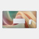 The image showcases a close-up of abstract waves formed by fabric. The fabric features a subtle texture and is colored in pastel shades of teal, pink, and peach. The waves create a sense of movement and depth. The lighting is soft and diffused, enhancing the gentle and calming mood of the image. The background is blurred, focusing attention on the fabric's form and color transitions.