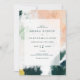Cette faire-part de mariage tout-en-un abstraite et colorée est parfaite pour votre mariage boho moderne unique. Peint à la main avec des marques texturées de vert émeraude foncé, de pêche et de moutarde, le tout recouvert d'un carré transparent minimaliste, il est sûr de donner à votre occasion une sensation bohème simple mais rustique.