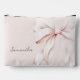 C'est une pochette de maquillage personnalisée élégante et stylée avec un fond rose doux orné d'un grand nœud en ruban rose délicat. Le design dégage un charme féminin et sophistiqué, parfait pour transporter vos produits cosmétiques et de beauté essentiels. La pochette peut être personnalisée avec un nom, ce qui en fait un cadeau unique et attentionné. Image de fond par Freepik