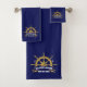 Offrez-vous un confort luxueux à la plage avec cette serviette de plage nautique de qualité supérieure. La grande serviette absorbante est dotée d'un design sophistiqué de roue de navire en blanc immaculé contre un arrière - plan bleu marine et or profond, apportant une touche d'élégance de station balnéaire à votre détente balnéaire.