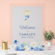 Élégantes pétales florales bleues et panneau de bienvenue Prosecco. Sipez, sipez, hourra ! 🎉 déterminez le ton de votre célébration de fête prénuptiale fabuleuse. Avec de superbes fleurs et un fond bleu clair, ce panneau de bienvenue sera certainement un succès. Articles assortis dans notre conception de fête Cava.