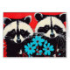 Adorable AI généré des ratons laveurs sur un arrière - plan rouge avec des fleurs bleues