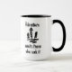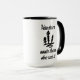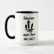 Simple tasse de camping en noir bicolore. Une image gribouillante d'arbres forestiers et les mots 'Aventure attend ceux qui la cherchent' dans un texte moderne noir. Parfait pour vous thé, café ou soupe pour tous ceux qui aiment le plein air, le randonnée et le camping. Cliquez sur le bouton "personnaliser" pour modifier l'image et le texte si vous préférez utiliser vos propres mots.