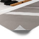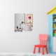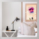 Une chambre moderne comporte une table de nuit blanche avec une lampe noire et des objets décoratifs, à côté d'un lit avec des oreillers à motifs. Un tableau encadré représentant des lèvres vibrantes et deux personnes assises ajoute une touche de couleur au décor minimaliste. Une image amusante dans une image.