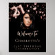 Une affiche de bienvenue pour une soirée glamour de 21ème anniversaire. Un arrière - plan noir classique décoré d'étoiles dorées roses. Personnalisez et ajoutez une photo et un nom. Le numéro 21 est écrit avec une police de style ballon.