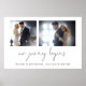 2 photos Notre Voyage Commence Noms Bienvenue Mariage. Un ensemble élégant de script pour la phrase romantique Notre Voyage Commence. Remplacez les deux exemples de photos par les vôtres et personnalisez avec votre message de bienvenue et vos noms en bas.