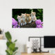 4 adorables chatons jaunes assis sur une rondelle entourée de fleurs violettes.
