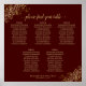 This 5 table wedding seating chart will help your guests find the right table at your reception. The design is both simple and elegant with gold text on a chocolate brown or auburn colored background and lacy floral filigree in the corners. The title reads "please find your table" in an elegant script calligraphy. Sophisticated and chic. Includes table assignments for 50 guests with 10 seats per table.