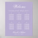 Un simple tableau de sièges mariage avec 6 tables sur 2 rangées pour la couleur mariage lavande. L'arrière - plan est violet lavande, le texte est blanc. Le mot Bienvenue dans la partie supérieure et les noms de la mariée et du marié sont écrits dans un élégant script calligraphique, le reste en casquette.