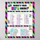 Retournez aux années 80 avec cette couleur néon What's Your 80s Nom signe de jeu avec balises incluses. Ce jeu des années 1980 ajoutera une activité amusante ou un brise-glace à votre fête d'anniversaire ou événement rétro des années 1980 - pour les enfants et les adultes!