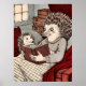 Une illustration détaillée représente un grand hérisson, probablement une mère, assis sur une chaise et lisant un livre à un plus petit hérisson, vraisemblablement son enfant. La mère porte une robe blanche avec un col blanc, tandis que l'enfant est vêtu d'une chemise marron avec un col blanc. Le livre est ouvert et a une couverture rouge foncé. La scène est éclairée par une lampe avec un abat-jour blanc, projetant une lueur chaleureuse sur les hérissons.