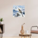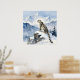 A pretty wildlife wall art poster with an illustration of a majestic snow leopard perched on a craggy, snow-covered peak, gazing out at a vast, frozen mountain range.