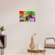 Cette affiche présente une abeille dorée rayée qui pollinise une fleur de verveine bonariensis violette. Le pollen est visible dans le sac sur sa jambe. Une fleur de pavot rouge colorée et un feuillage vert lumineux ajoutent à la sensation estivale magnifique et ensoleillée. Les ailes en lambeaux sont un message que la vie peut être dure au paradis.