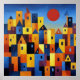 Transform your space with this vibrant Abstract Geometric Cityscape. Inspired by Paul Klee and Bauhaus art, this print features a colorful mosaic of stacked buildings and towers under a bold red sun.